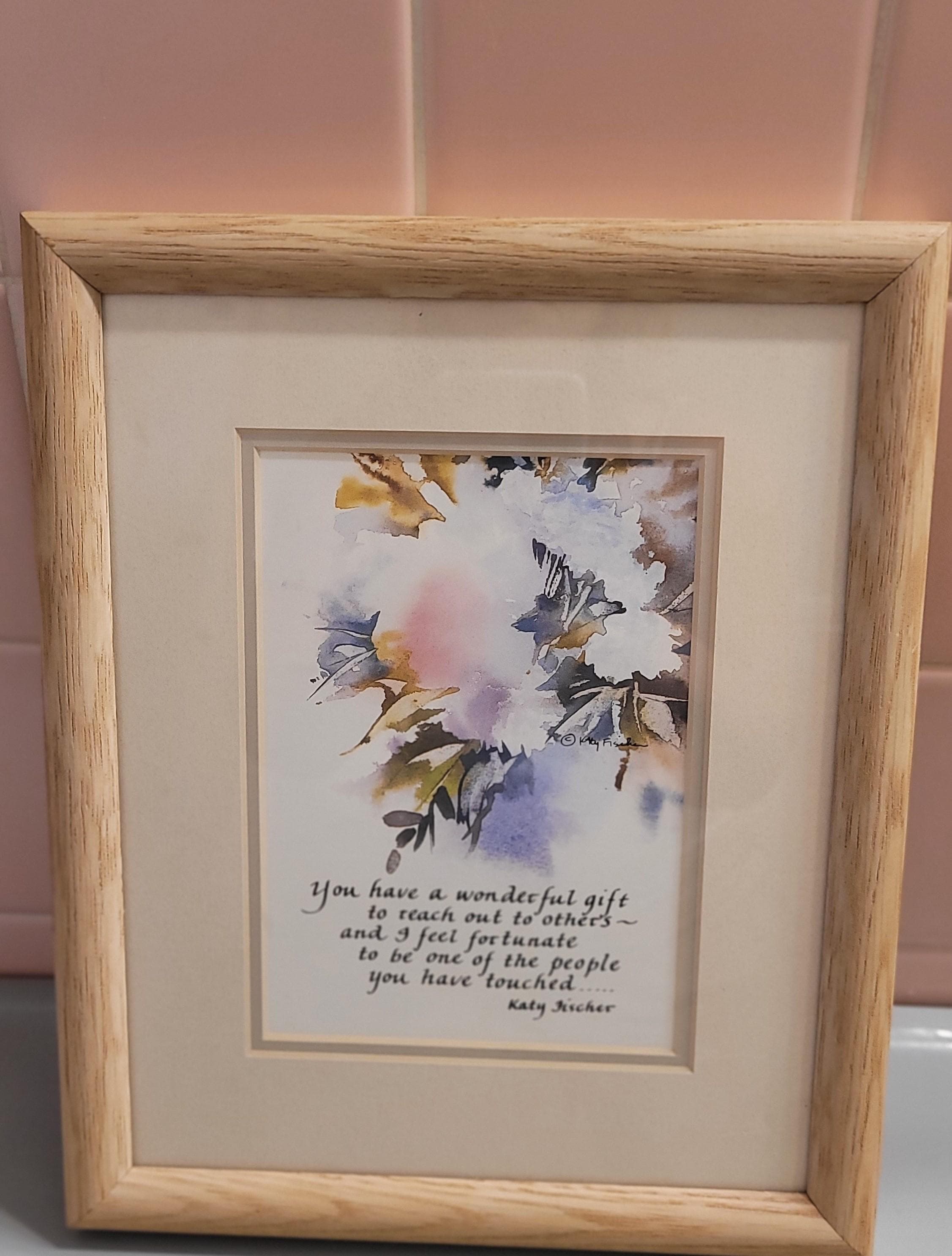 You are viewing a framed piece of artwork with a soft, pastel watercolor design of abstract flowers in shades of blue, pink, and yellow. Below the artwork, there is an inspirational quote by Katy Fischer, written in an elegant calligraphy font: